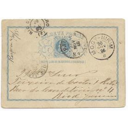 • 1885-Bilhete postal de 50Rs circulado para o Rio de Janeiro  com carimbo de saída "Mogy-Mirim".