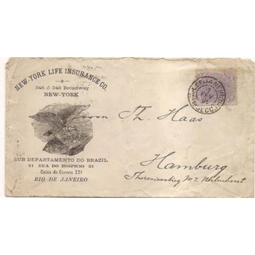 1894-Envelope com propaganda da New York Life Insurance circulado para a Alemanha com selo de 200Rs Cruzeiro do Sul de acordo com o 1o porte internacional.