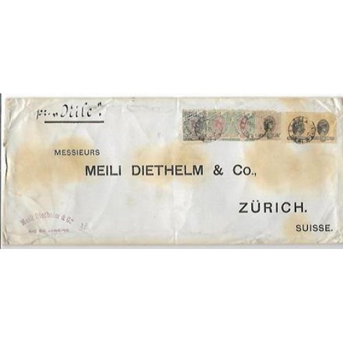 1898-Envelope para a Suissa,com selo de 2000Rs em papel gessado, Madrugada sobre carta junto com par de 1000Rs selo de 700Rs e par de 200Rs em total de 5100Rs conforme anotação no verso "250Grs 17X 300Rs= rs 5100" correspondente ao 17 porte internacionalç.Muito raro