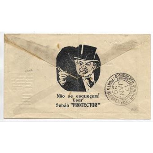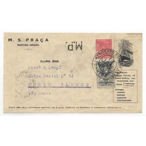 1930-Envelope circulado de Santos para Porto Alegre via Condor porteado em 300Rs com selo regular e em 2000Rs com selo Victor Konder. Bela publicidade no verso.
