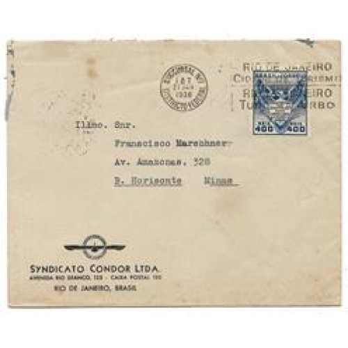 1938-Envelope do Rio de Janeiro para Belo Horizonte com 400Rs Constituição Americana , carimbo publicitário "Rio de Janeiro Cidade de Turismo-Rio de Janeiro Turisma Urbo"