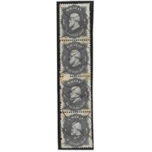 Etiquetas: 28-200Rs D.Pedro "Barba Preta", tira vertical de 4 selos obliterada á pena. Única reportada no estudeo da revista Mosaico.