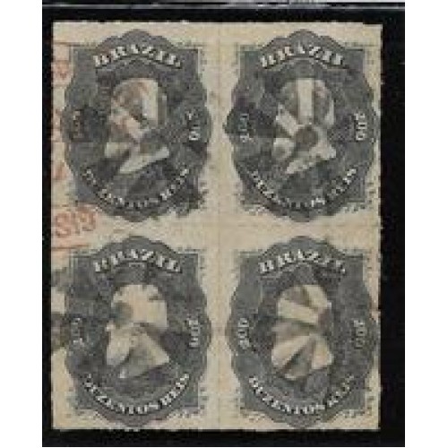 35- 200Rs D.Pedro "Percê", quadra usada com carimbo mudo e registrado em vermelho.