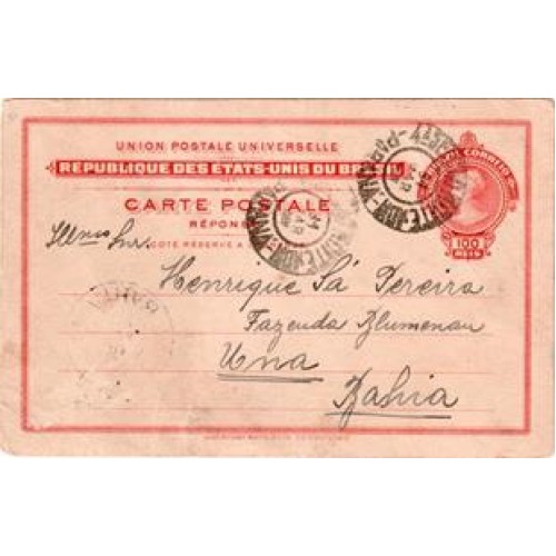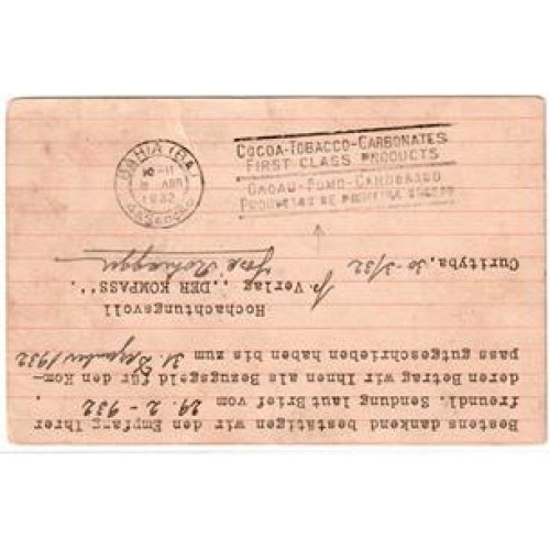 Etiquetas: 1932-Bilhete Postal de Resposta de 100Rs circulado da Bahia para o Rio com carimbo publicitário bilingue batido á saída "Cacau-Fumo.Carbonado-Productos de Primeira Ordem"