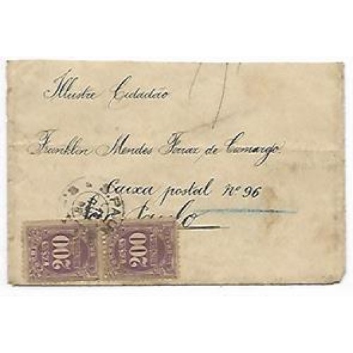 1898-Envelope para S.Paulo sem porte pago na origem , taxado com par de 200Rs violeta escuro, dent. 11, emissão de 1893