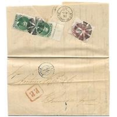 1871-Carta do Rio a Buenos Aires, porte de 200Rs de acordo com a Convenção Brasil-França, tarifa reajustada em 1871, com par de100Rs com legenda e 20Rs D.Pedro barba preta