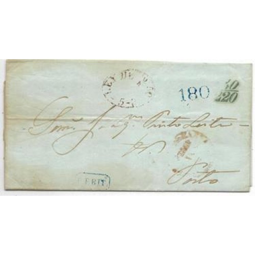 1851-Carta circulada de Penedo, Alagoas, para o Porto  por vapor inglês , 2º porte maritimo português de 180Rs batido em azul, acrescido de 40Rs pelo trajeto de Lisboa ao Porto, conforme carimbo 40/180 batido em verde, imposto da Ley do Selo de 5Rs  conforme carimbo oval batido em sepia e carimbo 'P.Brit." denotativo de paquete britanico.