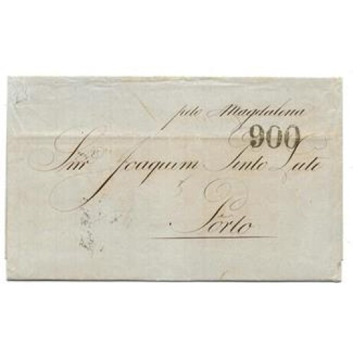 1863-Carta circulada da Bahia para o Porto pelo vapor Magdalena da Royal Mail com porte marítimo português de 900Rs correspondênte ao 6º porte para vapores subsidiados.