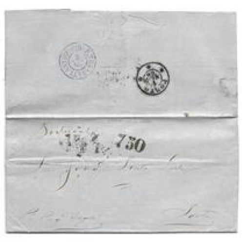 1866-Carta circulada do Rio de Janeiro parta Lisboa pelo vapor Rhoneda da Royal Mail com porte marítimo português de 750Rs corrrespondênte ao 5º porte para vapores subsidiados.
