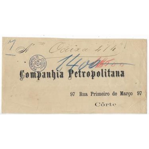 • 1889-Frente de carta de Petropolis para o Rio sem porte pago na origem e taxado em 1400Rs conforme anotação em lapis de cera azul