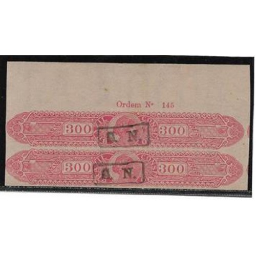 Imposto de Bebidas-325- 300Rs, vermelho, sem denteação, filigrana Casa da Moeda, emissão de 1910/14, par margem superior da folha com o numero de ordem da emissão