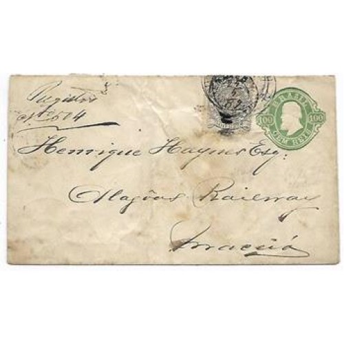 1889-Envelope de 100Rs registrado de Cinco Pontas para Maceió com selo adicional de 300Rs Tipo Cruzeiro do Sul. Carimbo de saída no verso de "Cinco Pontas e curiosa anotação "acompanha uma caixa com 1 argola e 3 chaves"